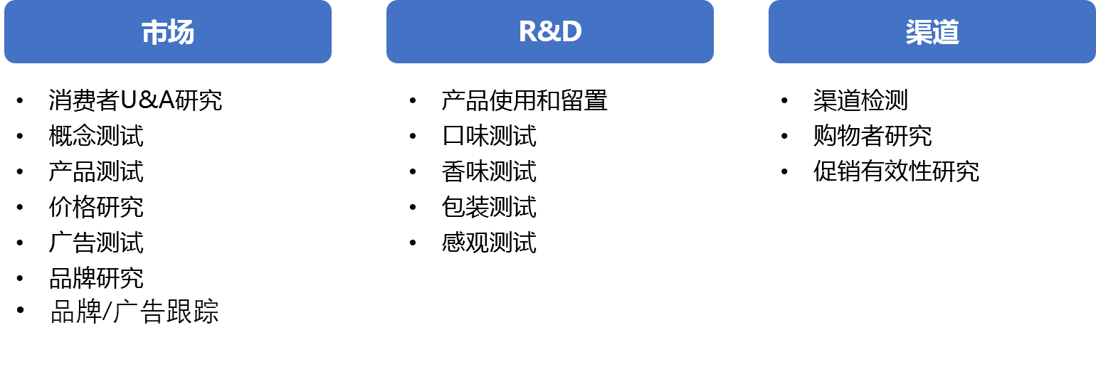 消費品(快消品)研究包含可行性研究、消費者U&A研究、概念測試、市場細分研究、產(chǎn)品測試、新產(chǎn)品創(chuàng)新開發(fā)、品牌研究及品牌定位、品牌評估與傳播、廣告及活動效果評估、服務(wù)滿意度研究、渠道監(jiān)測等等。華夏經(jīng)緯研究團隊提供新產(chǎn)品從機會識別到上市、量產(chǎn)及升級的全流程服務(wù)。